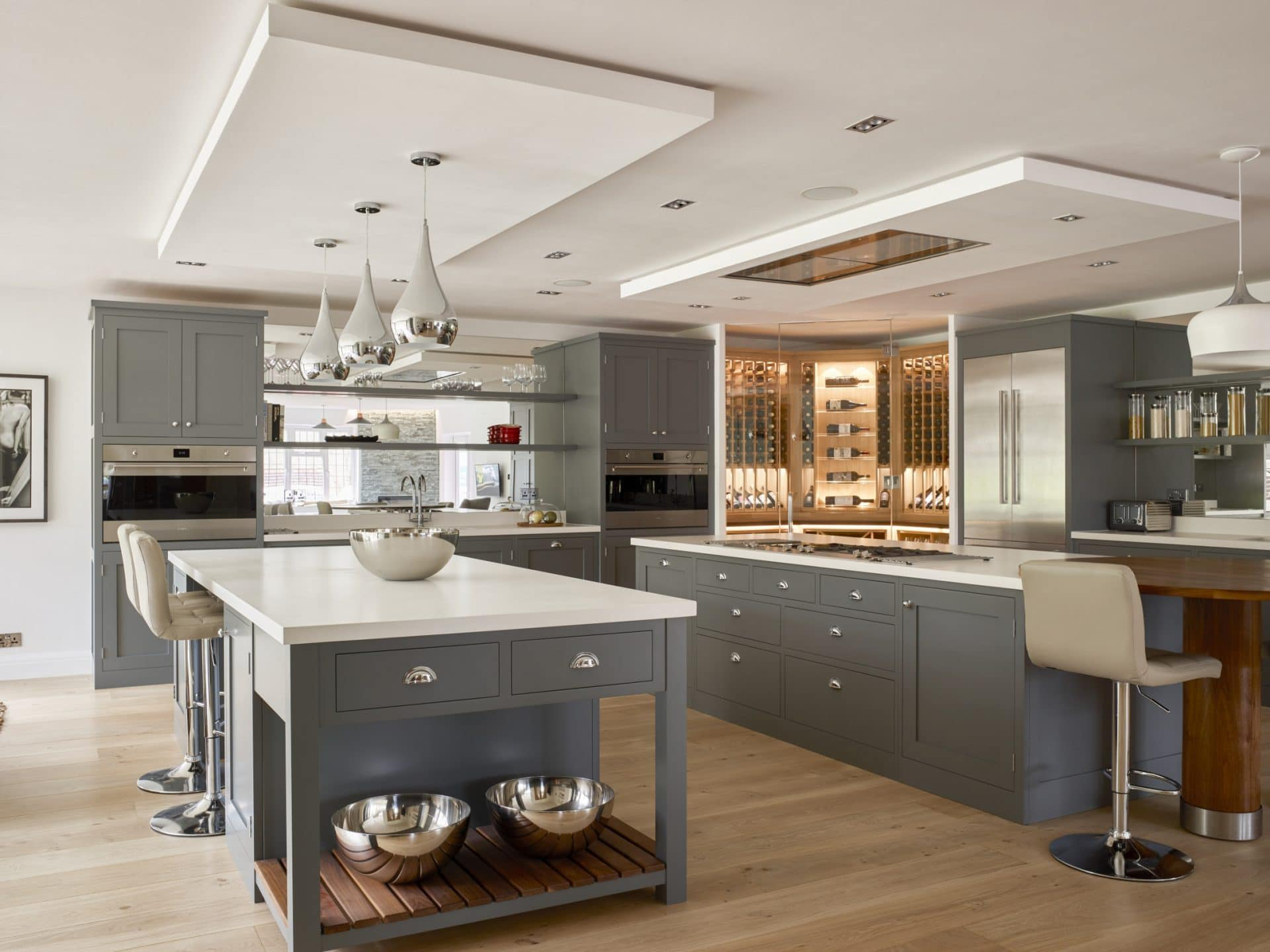 Here is an amazing modern kitchen design, an absolute dream! A drop ceiling added to this culinary space contributed to the contemporary vibe. The concept of the two islands works around the two priorities of this kitchen, which are cooking and entertainment.